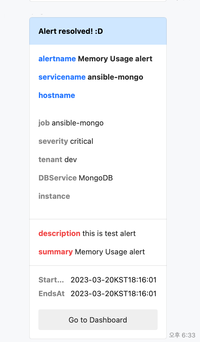 이렇게 Save하고, Test 를 진행하여 지정된 알럿 채널을 통해 알럿을 수신할 수 있습니다.