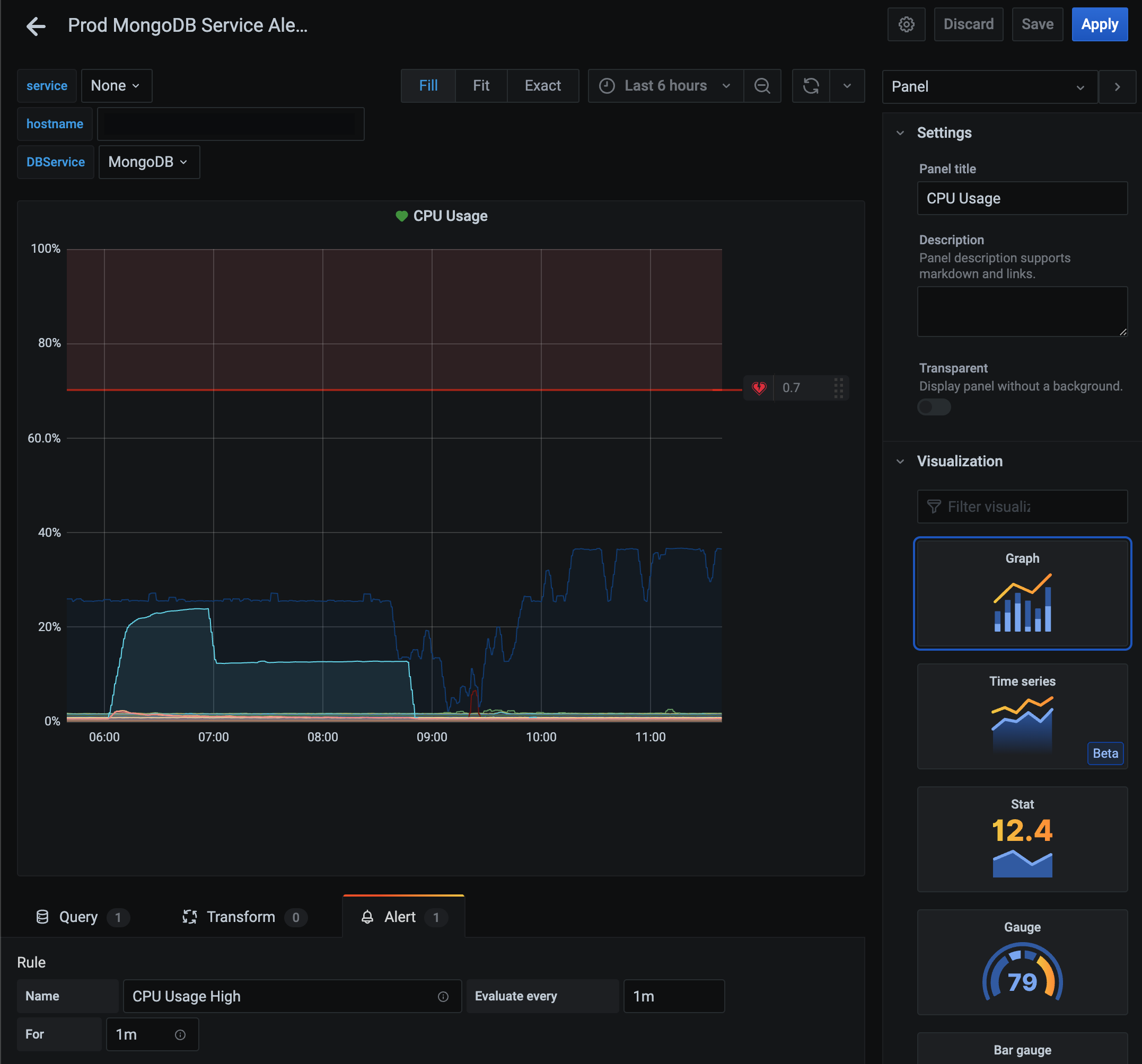 Panel Visualization type이 Graph인 경우에만 alert 구성이 가능합니다.