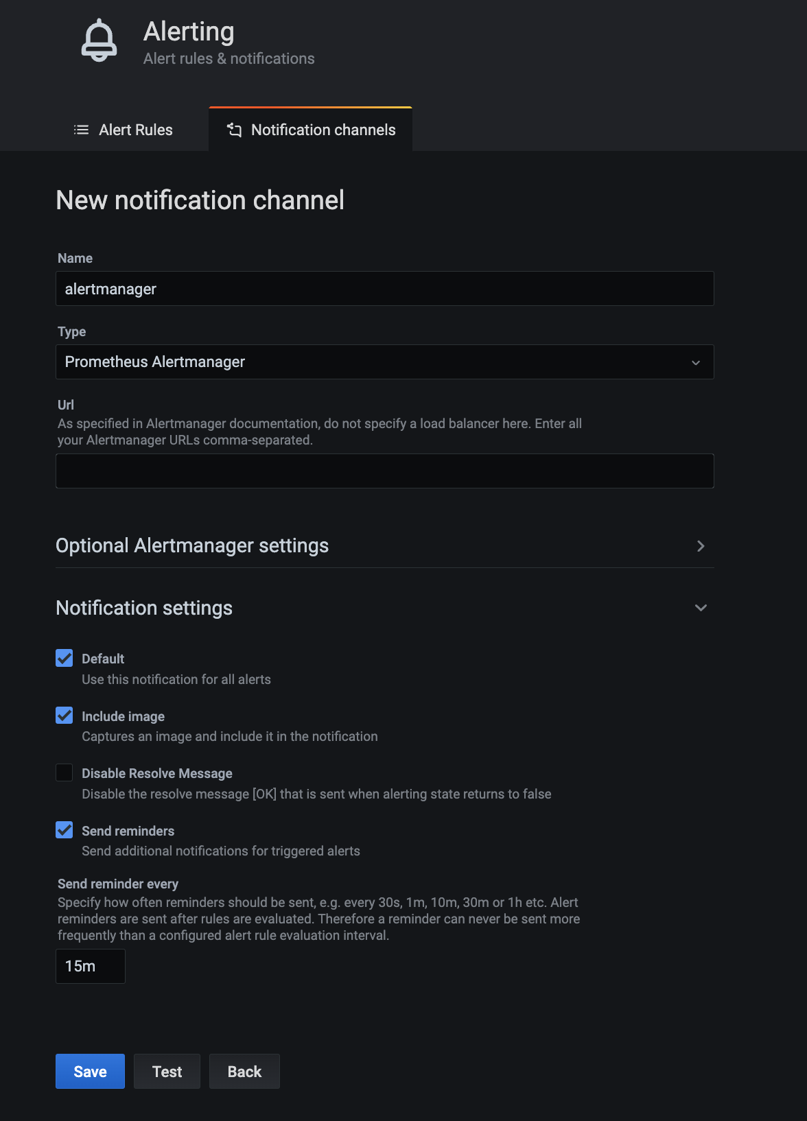 그라파나에서 구성한 알럿을 Alertmanager 가 관리하도록 연동합니다.