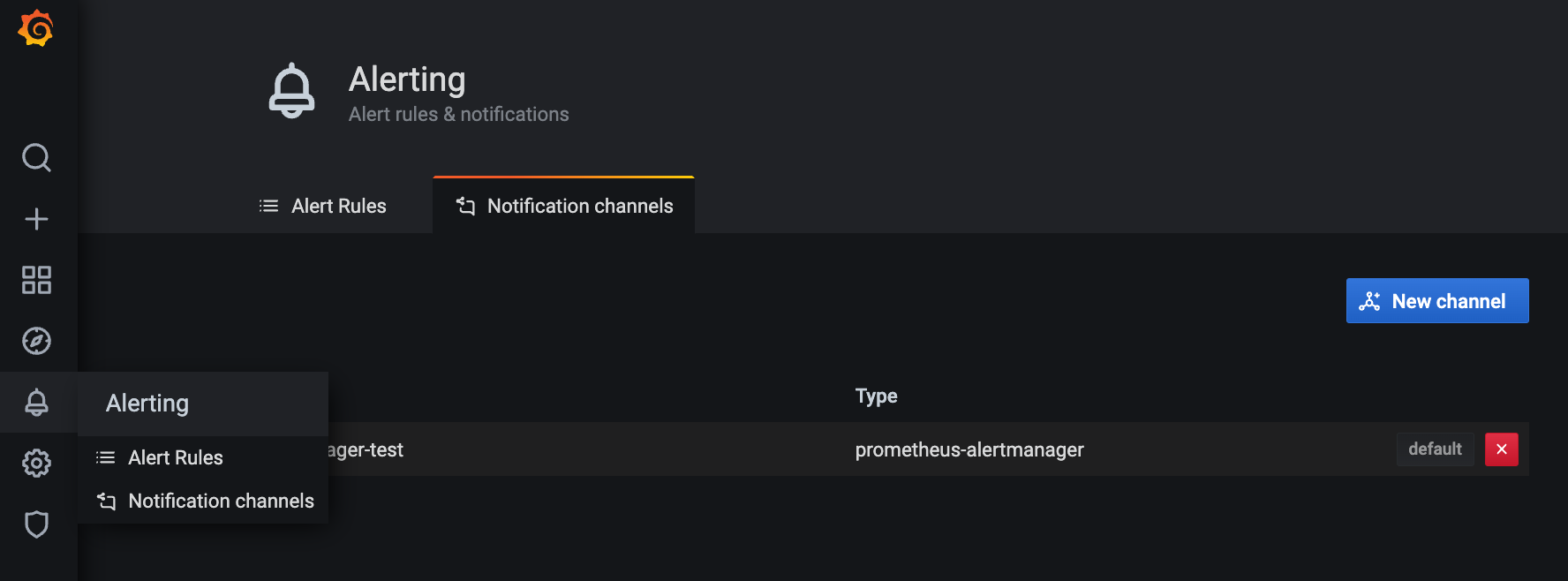 Alerting 페이지로 이동하고, 알럿을 수신 채널 설정을 위해 notification channels 탭을 선택합니다.