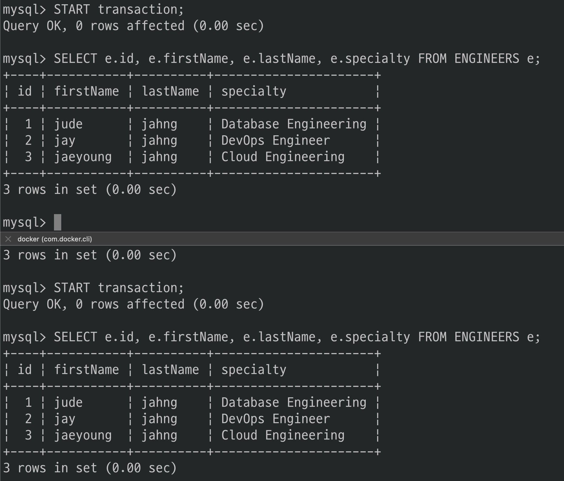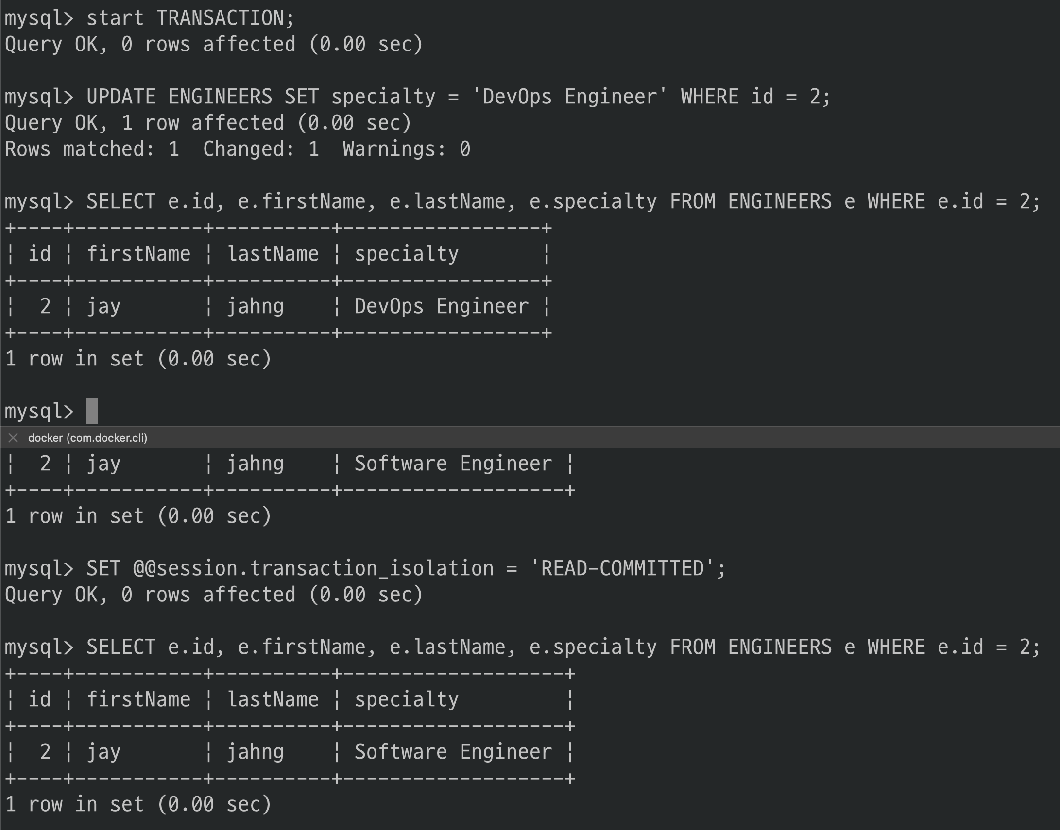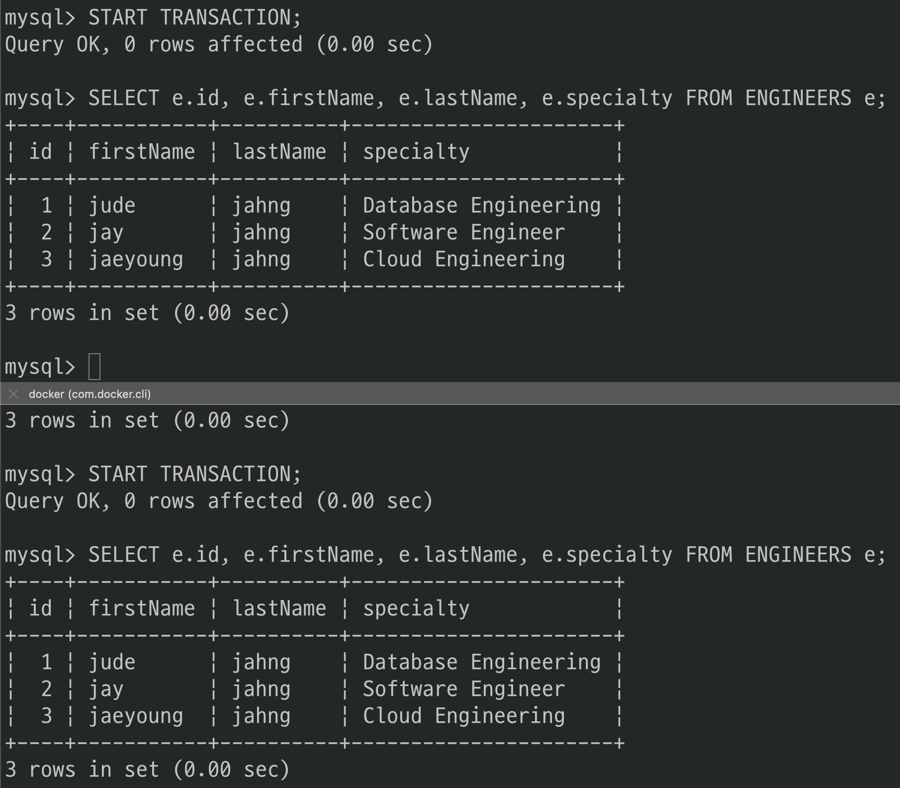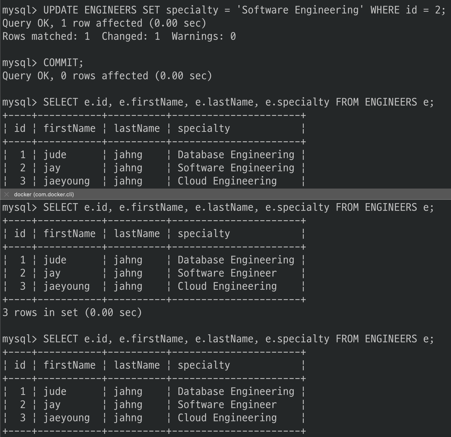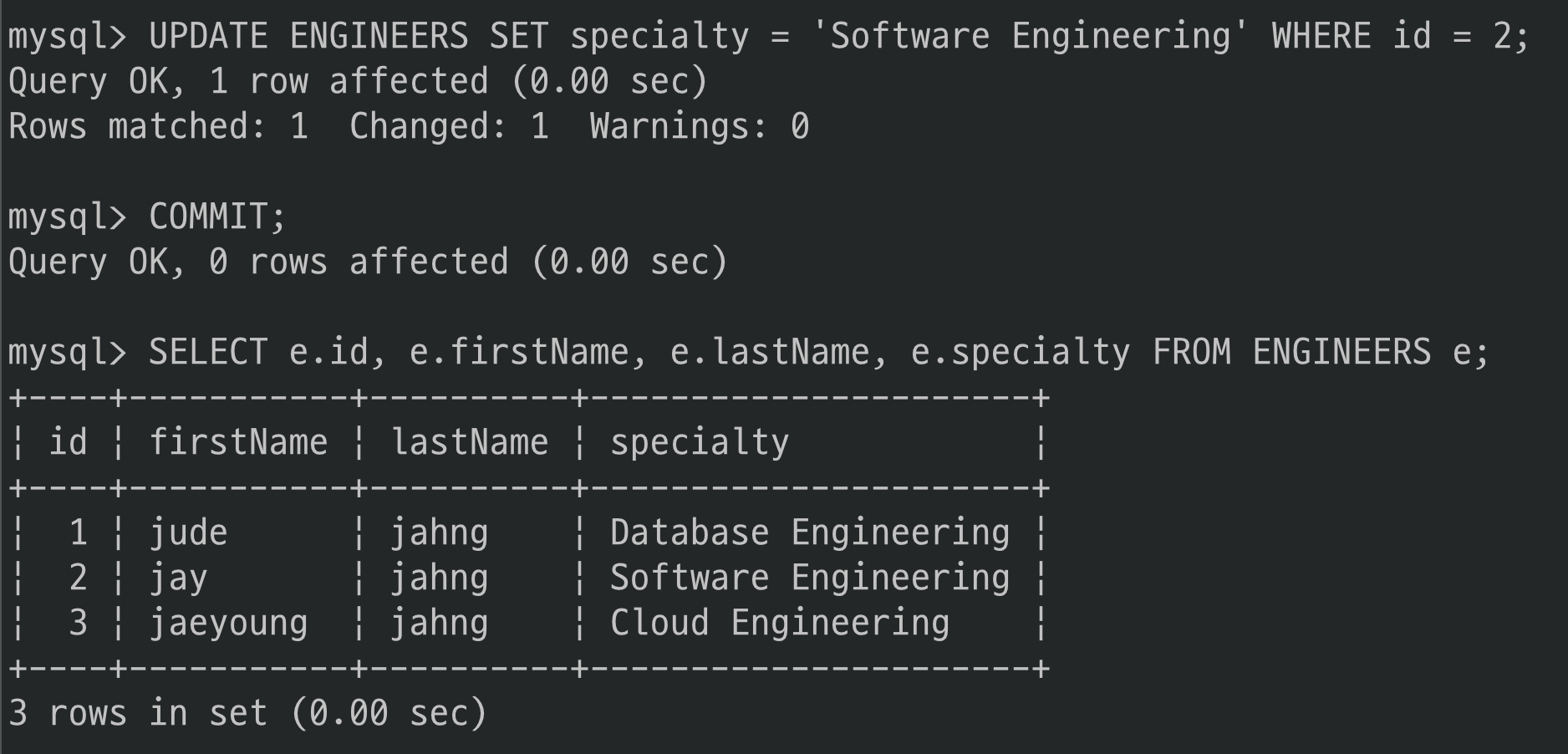 그러나 specialty의 값이 트랜잭션 전과 후가 다르게 조회되었네요.(‘Software Engineer’ -> ‘Software Eingeering’)