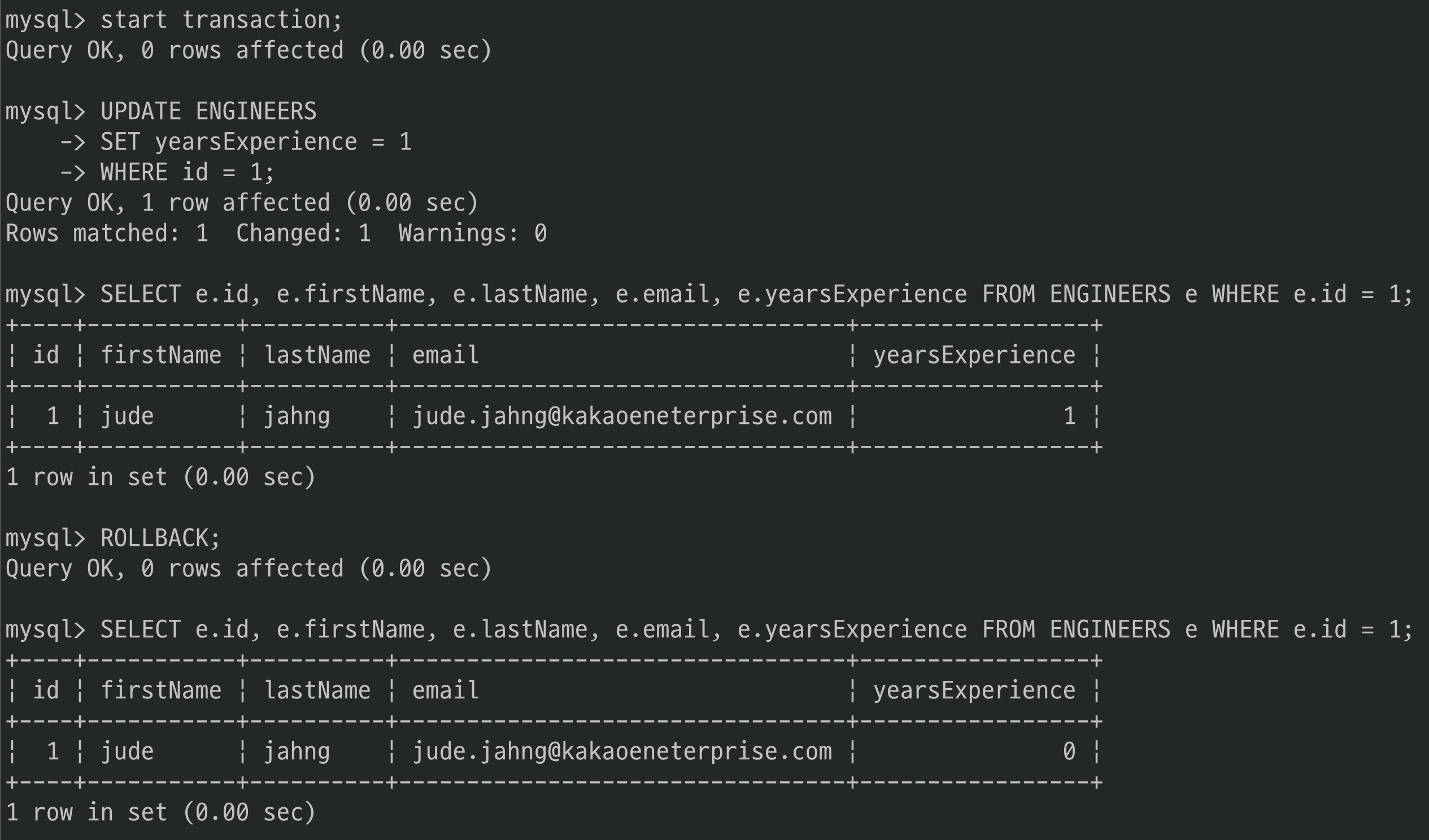 여기서도 업데이트한 레코드의 yearsExperience 컬럼의 값이 다시 0으로 조회되는 것을 확인할 수 있습니다.