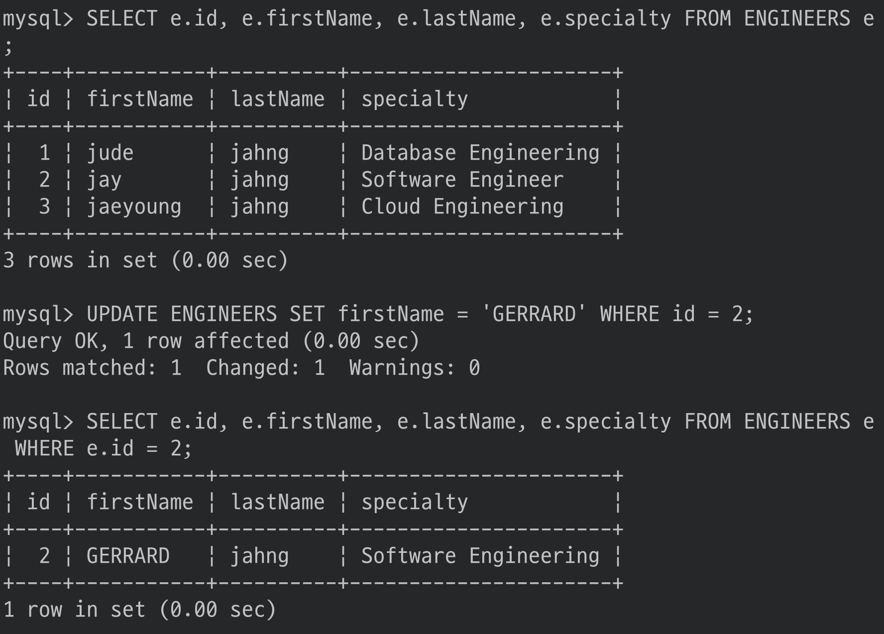UPDATE ENGINEERS SET firstName = 'GERRARD' WHERE id = 2;
