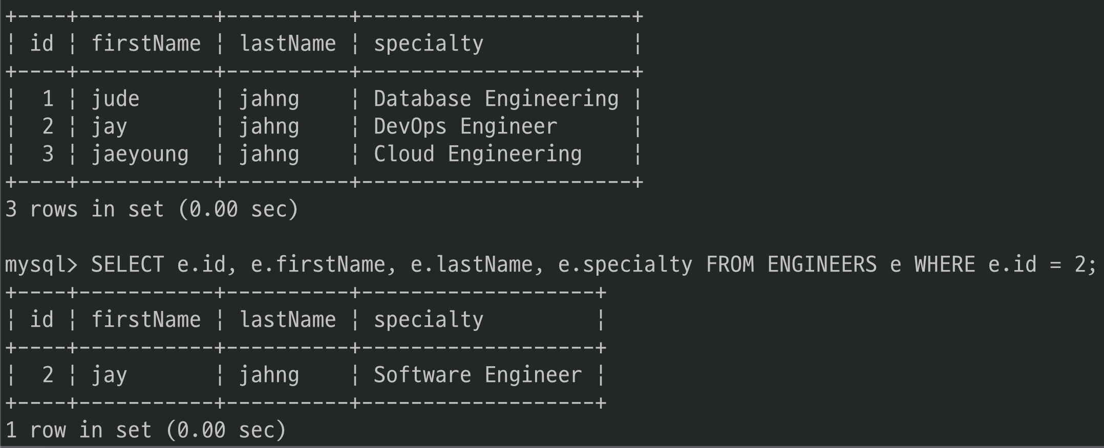 쿼리는 ENGINEERS 테이블의 id = 2