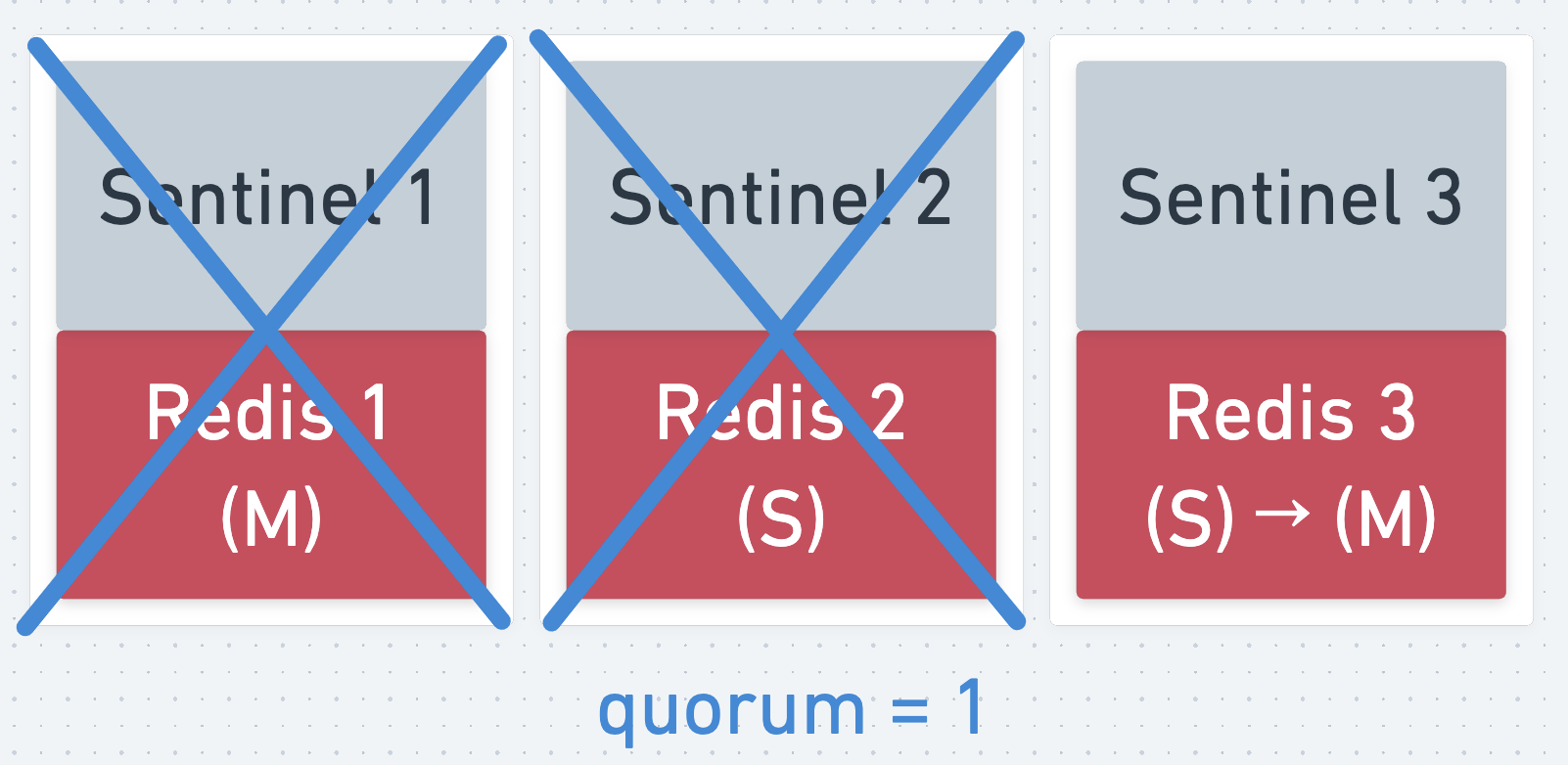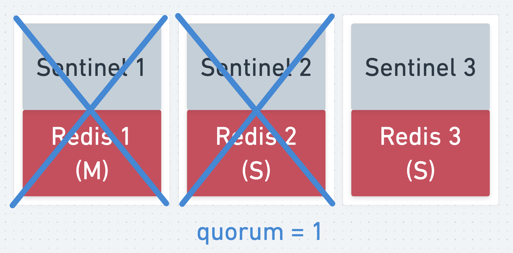 결론적으로 Sentinel은 quorum의 조정에도 그룹의 과반이 존재해야 함을 확인했습니다.