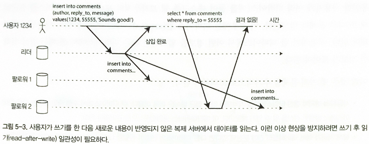 프라이머리에 변경사항(DML, CREATE, UPDATE, DELETE) 이 있었을 때, 세컨더리에 복제가 지연되어 따라잡지 못한다면? 쓰기 후 읽기 일관성이 보장되지 않을 수 있겠죠.